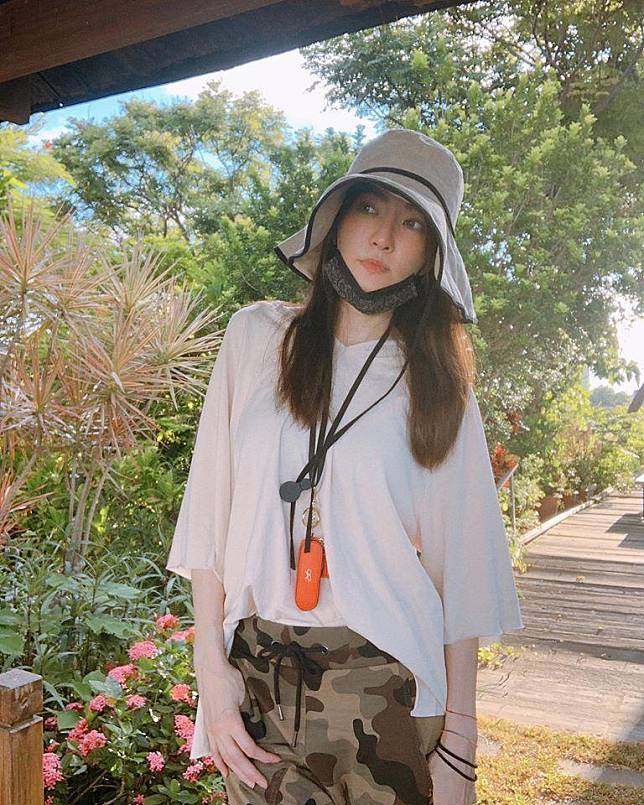 谢金燕穿著宽松上衣搭配迷彩裤,头上戴著一顶休闲帽,一副轻松的打扮。(翻摄自谢金燕脸书)