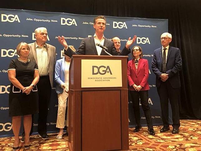 See detail加州州长纽森(中)宣布周二单日确诊人数超过12,800例,突破该州纪录。图为2019年记者会画面。(翻摄自Gavin Newsom脸书)