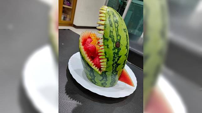 1名人父分享因为孩子幼稚园的水果派对,自己亲手「果雕」2头鲨鱼。(图翻摄自爆废公社)