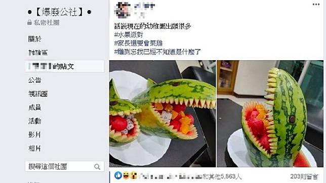最後男网友忍不住抱怨,「话说现在的幼稚园出头(台语∶意指把戏)很多!水果派对,家长还会果雕,雕到忘我已经不知道是什麽了!」