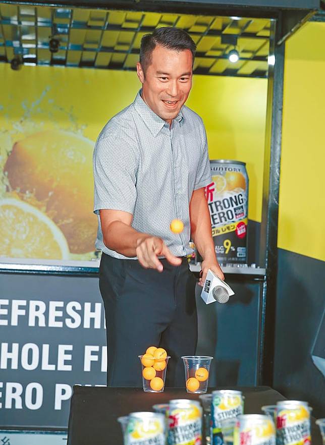 张孝全昨在现场与粉丝一起玩乒乓球弹跳酒杯游戏。(卢祺摄)