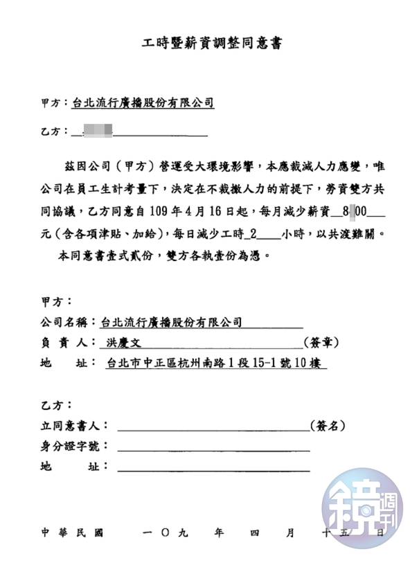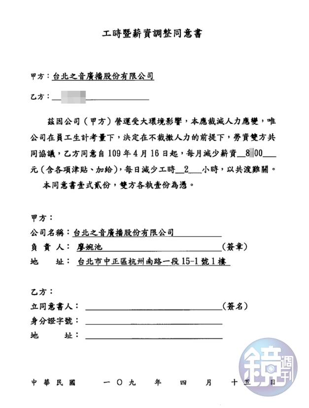 根據台北之音、POP Radio要求員工簽署的「調整薪資暨工時同意書」內容來看,上面載明「滋因公司(甲方)營運受大環境影響,唯公司在員工生計考量下,決定在不裁撤人力的前提下,勞資雙方共同協議,日本藤素功效日本藤素評價心得日本藤素吃法japan tengsu乙方同意自109年4月16日起,每月減少薪資8X00元(含各項津貼、加給),每日減少工時2小時,以共渡難關。」