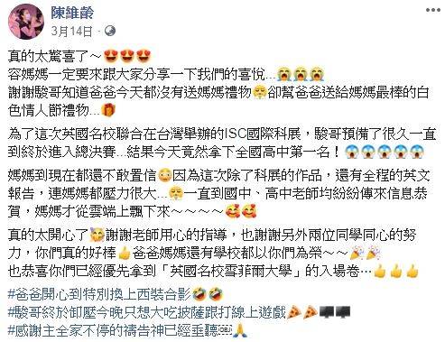 ▲陳維齡高興透露兒子高一就拿到英國大學的入場券。(圖/翻攝自臉書)